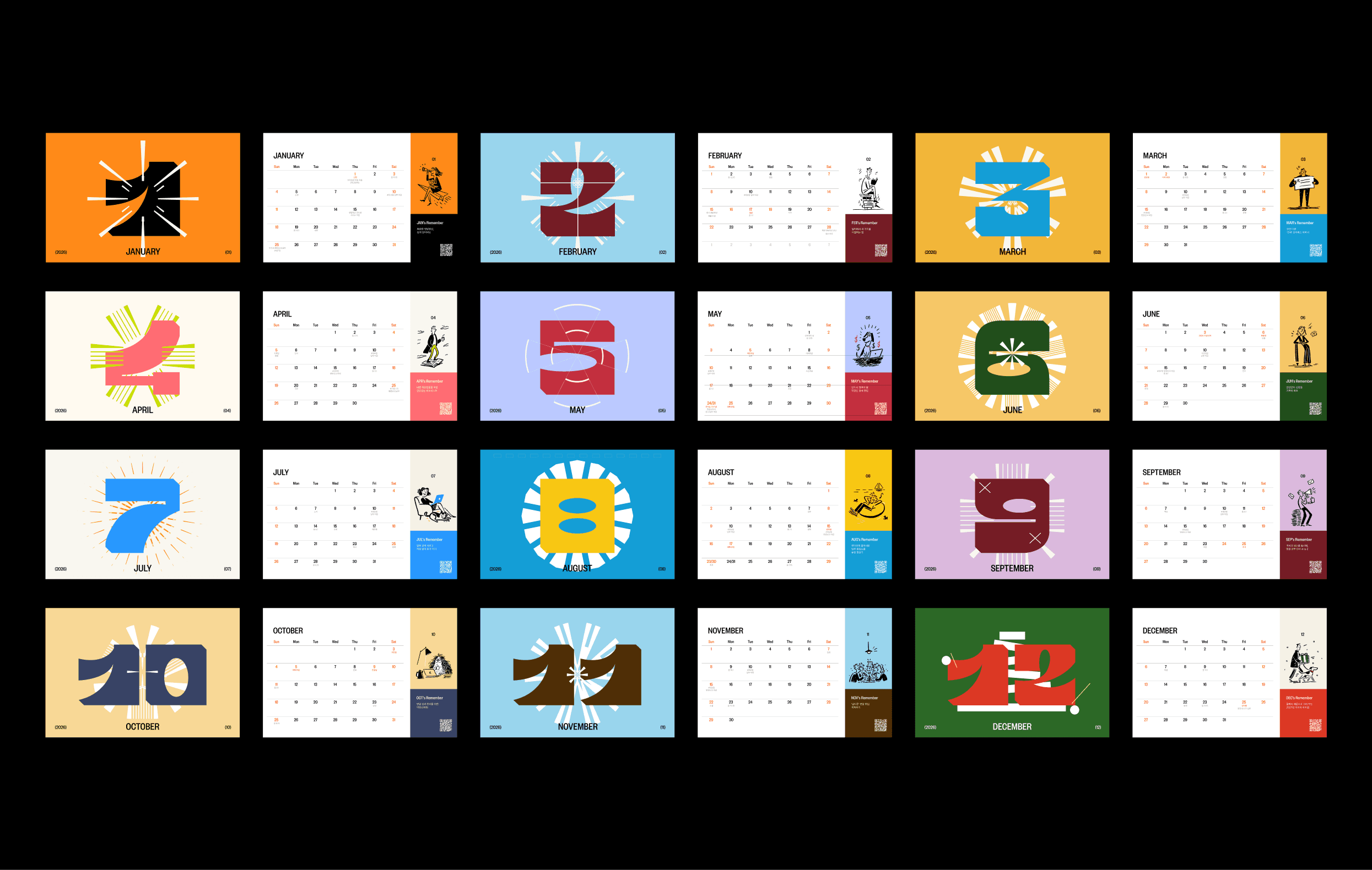 각 월마다 직장인들이 공감할 수 있는 주제를 일러스트와 QR 코드로 연결해 콘텐츠 경험으로 확장했습니다. 특히 12개월의 일러스트는 리멤버만의 미드저니 스타일 에셋을 직접 구축해 일관된 톤을 유지하면서도 제작 효율을 극대화했습니다. 오프라인 굿즈가 일회성 소모품에 그치지 않고, 매월 브랜드와 소통하는 접점으로 기능하도록 설계하는 데 초점을 맞췄습니다.